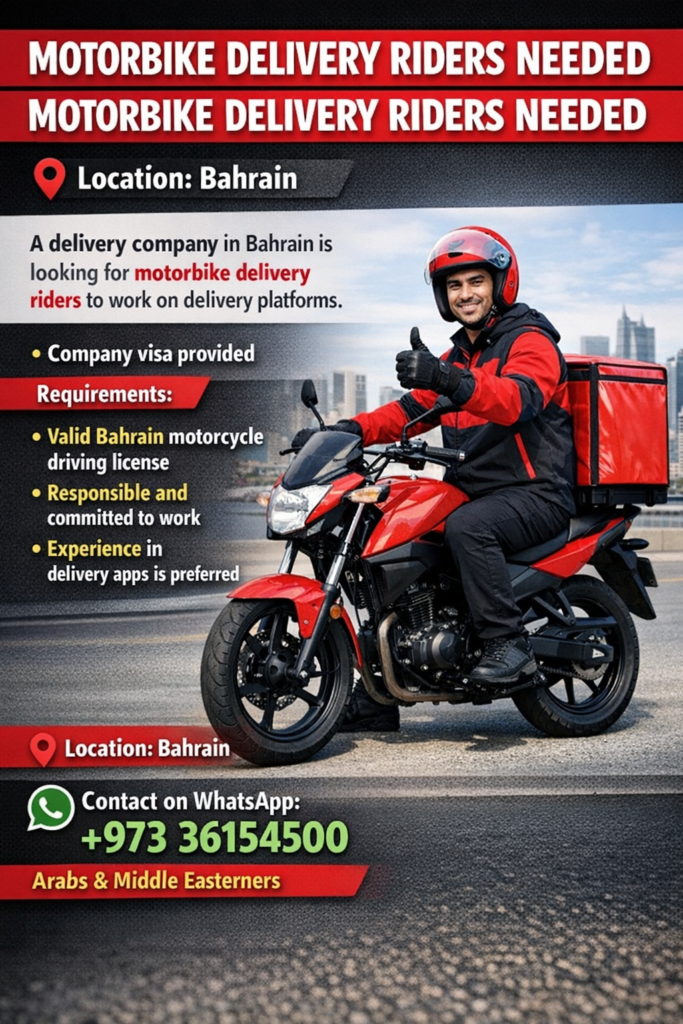 A delivery company in Bahrain is looking for motorbike delivery riders to work on delivery platforms.